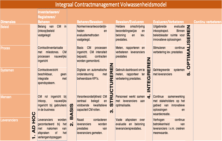 In 2023 ontstond de vraag om het contractmanagement voor beheer- en onderhoudscontracten (B&O) verder te professionaliseren. De aanleiding: de uitrol van risico gestuurde contractbeheersing (RCB). Het bestaande volwassenheidsniveau was ‘ad hoc’, terwijl de ambitie helder was: groeien naar een gestructureerd en voorspelbaar contractmanagementniveau, passend binnen de kaders van inkoop en RCB.